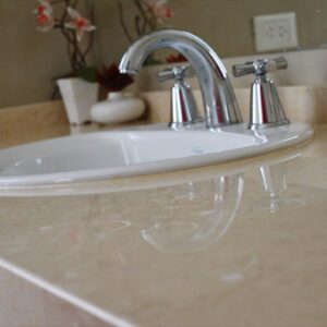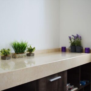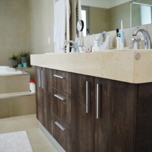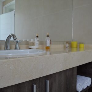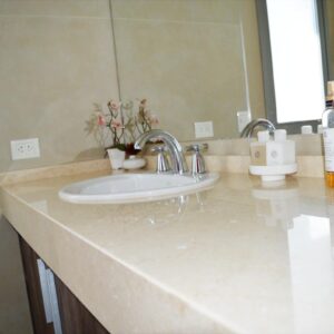 Vanitorys fabricados en mármol Beige con frentín de 15 cm cortado a 45º (para que simule ser una piedra masisa), con zócalos y colocación de bachas de embutir.