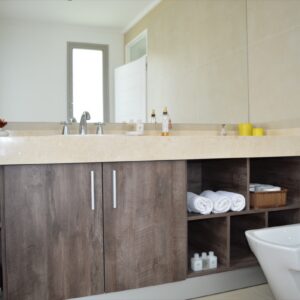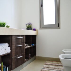 Muebles bajo vanitorys con cajones, puertas con estantes regulables en su interior y repisas abiertas; en placa color Terrarum de Faplac con manija Enigma de 160mm